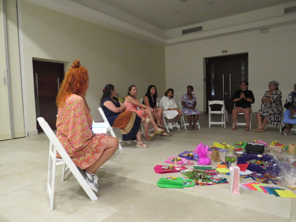 Taller Socioafectivo facilitado por la consultora Clara Cardona durante el Primer Encuentro “Feminismos que transforman, alzando nuestras voces”. En el centro, altar de autocuidado construido colectivamente (República Dominicana, 31 de julio de 2025).