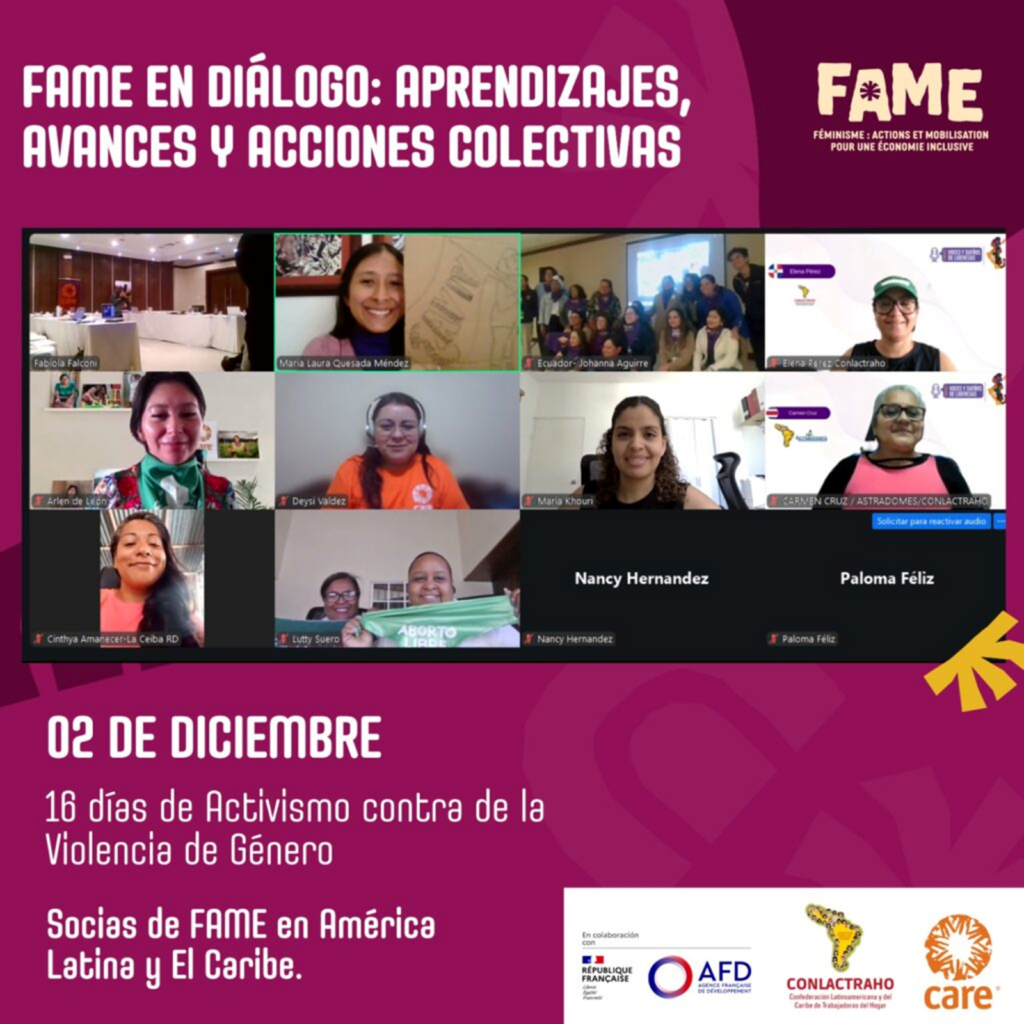 Le 2 décembre 2025, CONLACTRAHO et CARE, en tant que membres du consortium du projet Féminisme, action et mobilisation pour une économie inclusive (FAME) en Amérique latine et dans les Caraïbes, ont continué à renforcer la coordination régionale entre les organisations féministes d’Amérique latine et des Caraïbes, grâce à un événement marquant : « FAME en dialogue : apprentissages, progrès et actions collectives », organisé sous forme hybride. Nous avons pu compter sur la présence depuis l’Équateur de : SURKUNA, de la Fédération des femmes de Sucumbíos, de Ciudadanas del Mundo, de la Plateforme des femmes en marche vers l’égalité, de Las Reinas Pepiadas, de CEOSL et de l’UNTHA Corporación Humanas y Coordinadora de mujeres (Bolivie) et, depuis la République dominicaine, de Tertulia Feminista Sur, CONAMICA, UNISIMAS, La CEIBA ainsi que les réseaux régionaux RSMLAC, REPEM et CIPAF.